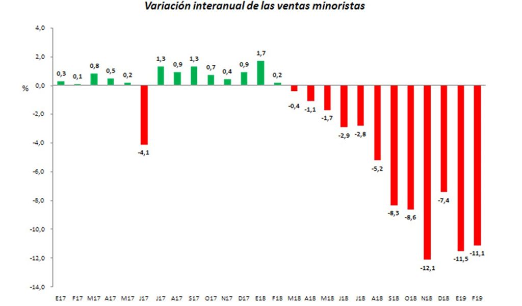 Las ventas minoristas de febrero sufrieron una caída del 11,1% con respecto al mismo mes de 2018. Con este derrumbe, son 12 los meses consecutivos de disminución en ventas que comenzaron en marzo del año pasado. El dato lo aportó el informe de la Federación Comercial de Córdoba (Fedecom).