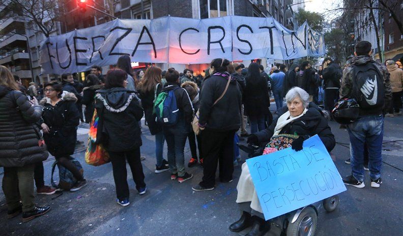 "Fuerza Cristina" escribieron sus seguidores en una enorme bandera argentina que primero fue extendida sobre la calle en la esquina de Juncal y Uruguay -que estuvo cortada al tránsito- y luego se colgó de la fachada del edificio.
