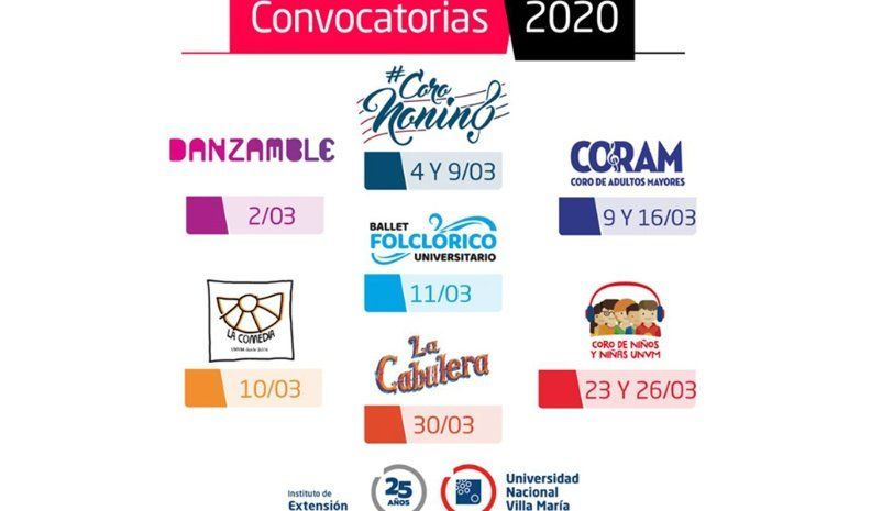 Los elencos estables, Danzamble, Coro Nonino, Coro de Adultos Mayores (CORAM), Ballet Folklórico Universitario, La Comedia, La Cabulera y el Coro de Niños y niñas, de la Universidad Nacional Villa María (UNVM), abren sus convocatorias para audicionar a partir de marzo.