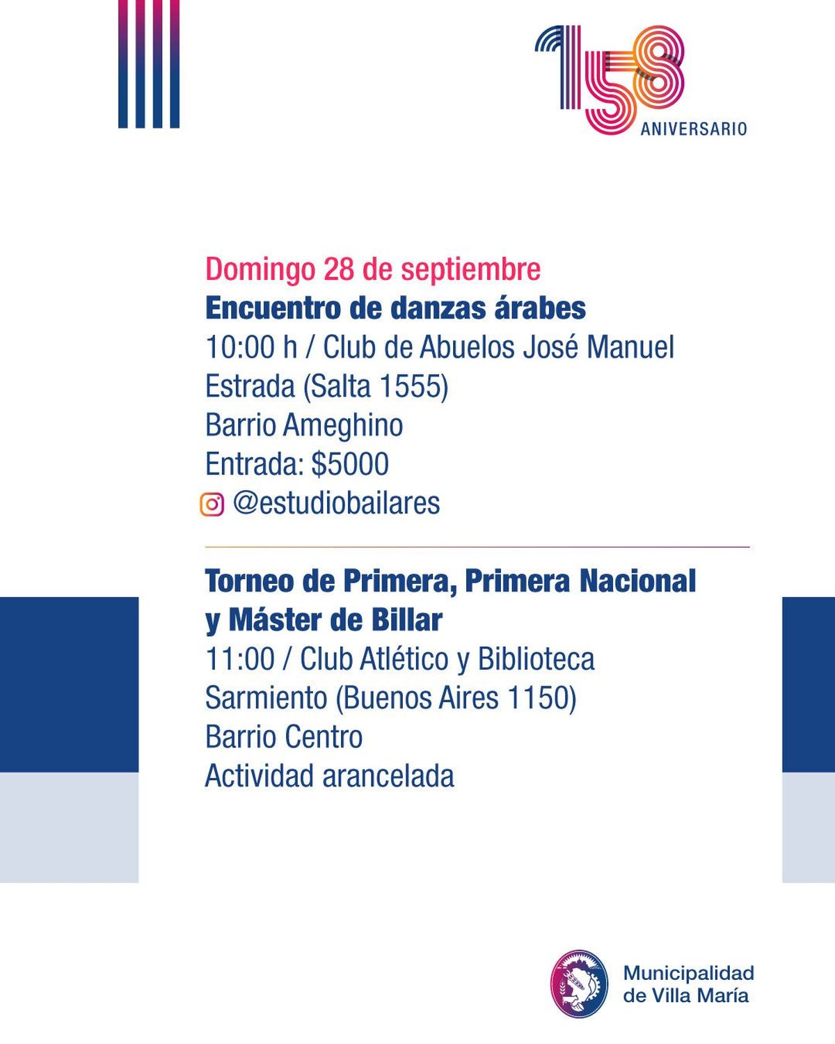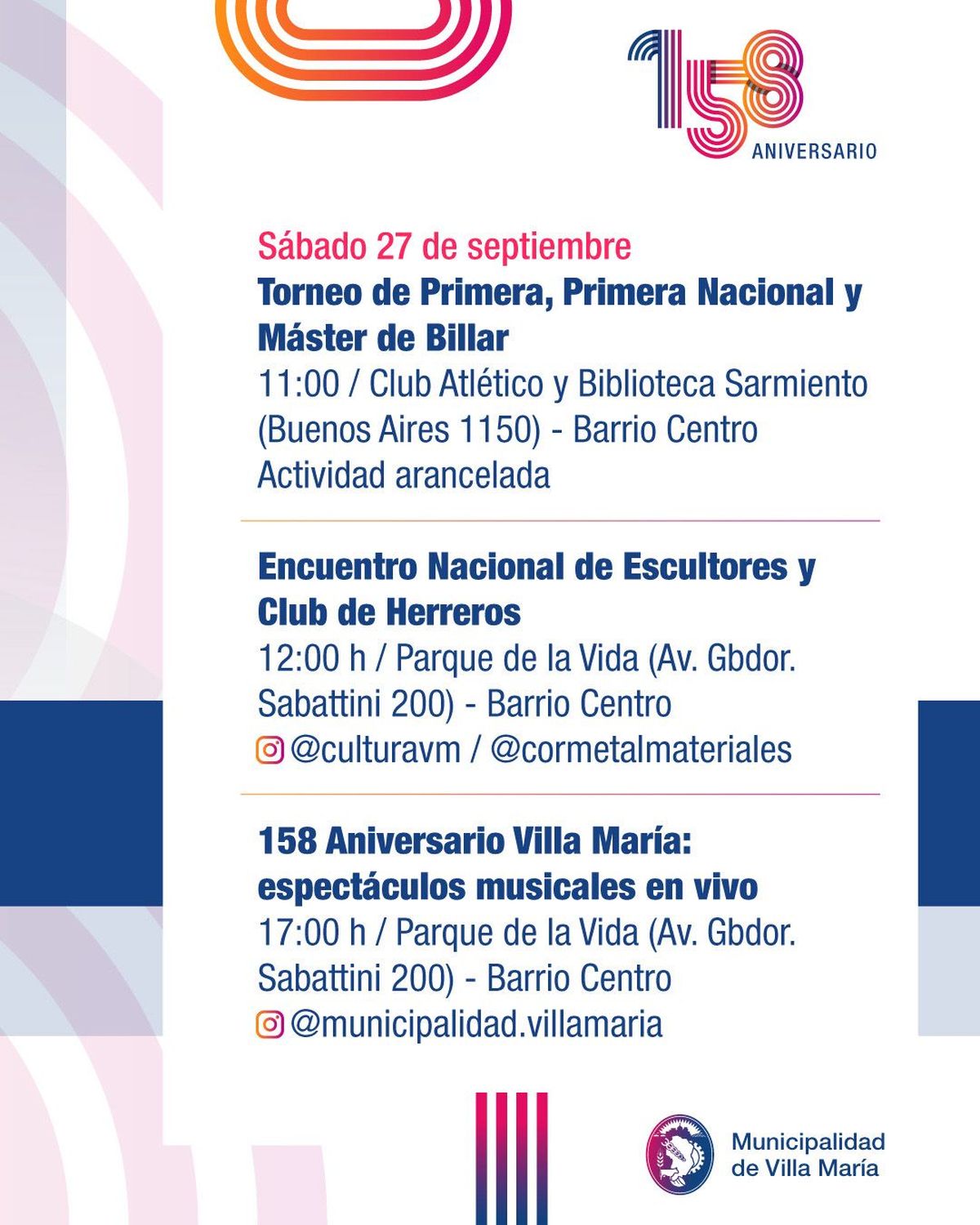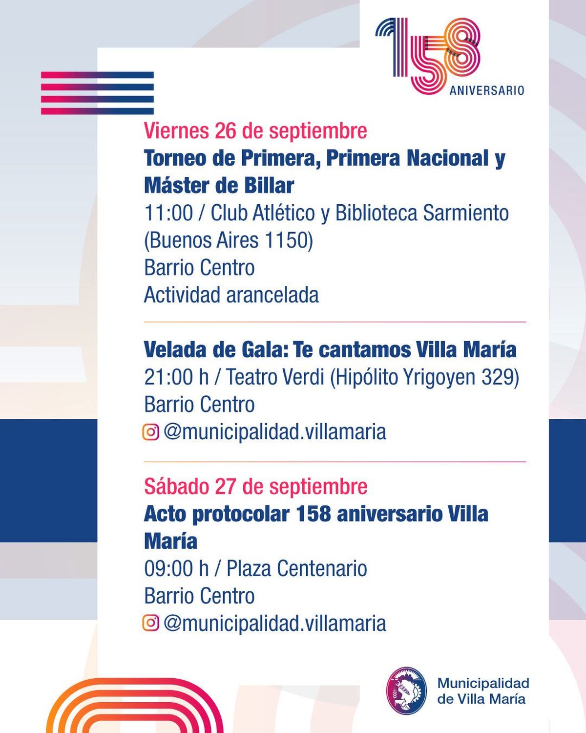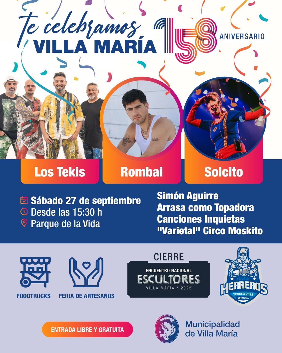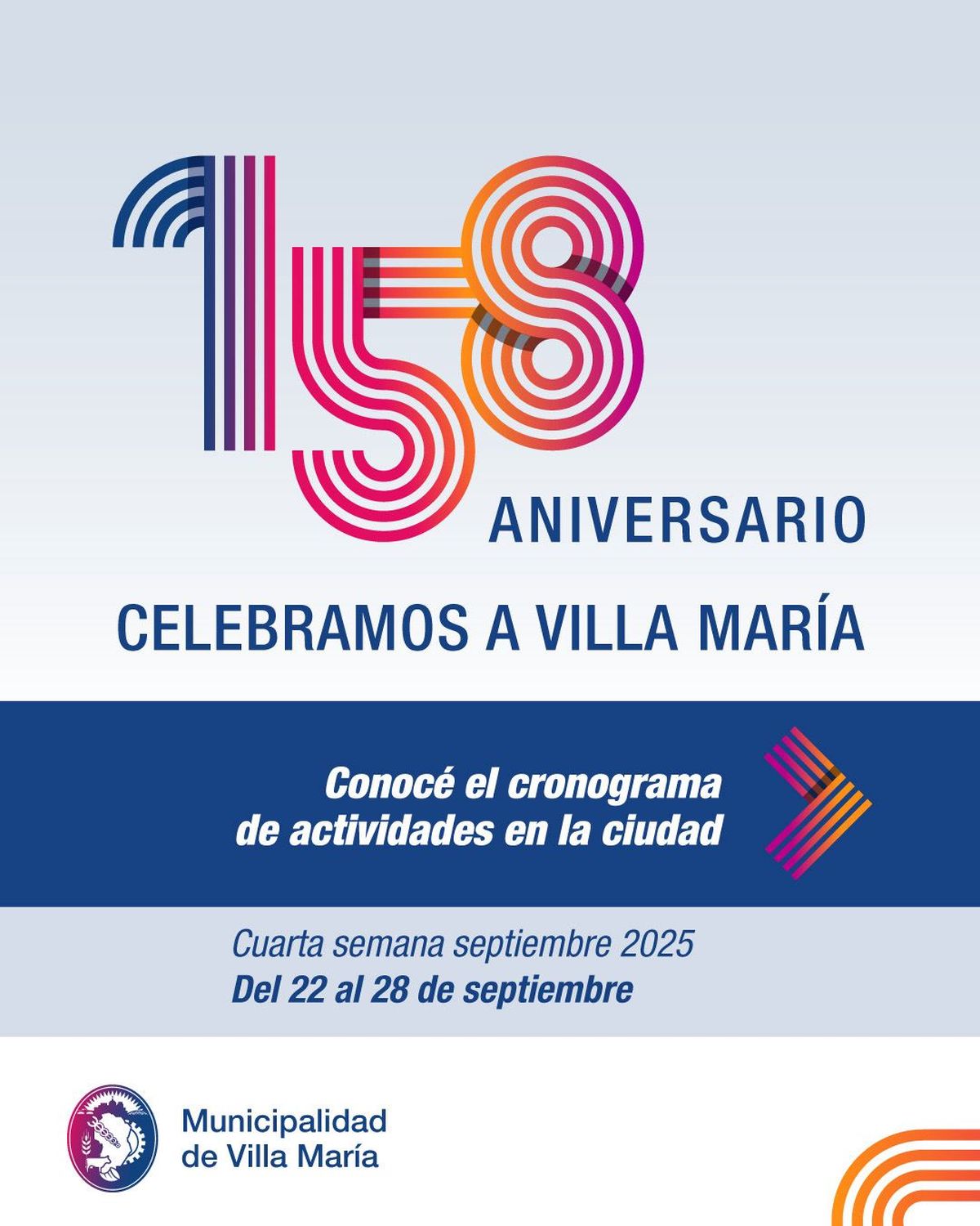 La ciudad de Villa María se prepara para conmemorar sus 158 años de historia, con una grilla de actividades pensada para toda la comunidad. Los festejos, organizados por la Municipalidad junto a instituciones locales, abarcan espectáculos, muestras y encuentros que buscan poner en valor la identidad villamariense.
