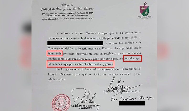 “Se informa a la señorita Carolina Ferreyra que se ha concluido la investigación previa sobre la denuncia por ella presentada contra el presbítero (...) La misma fue enviada a la Congregación del Clero. Posteriormente este Dicasterio ha respondido que la Santa Sede considera inconveniente que un presbítero preste un servicio político como el de intendente municipal, y por otra parte, considera que las denuncias que pesan sobre él son creíbles y graves”.