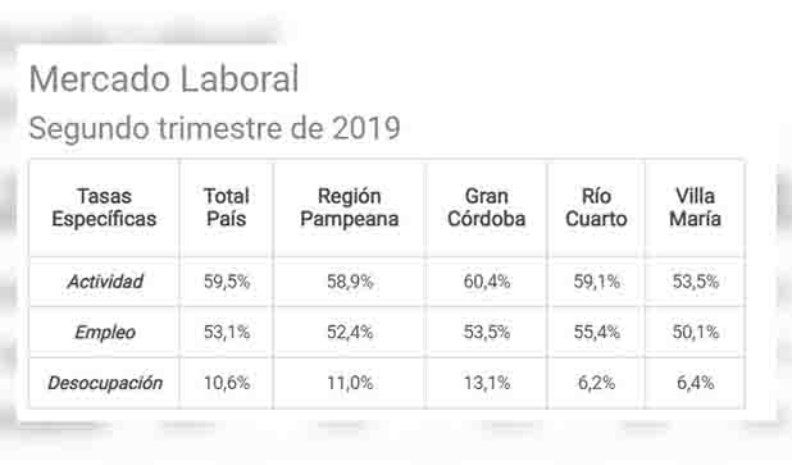 En Villa María la desocupación se ubicó en el 6,4 por ciento en el segundo trimestre del año. Es 0,1 por ciento menos que en el trimestre anterior y 0,5 por ciento menos que en igual período de 2018. Esto muestra cierta tendencia a la estabilización de la situación laboral local.