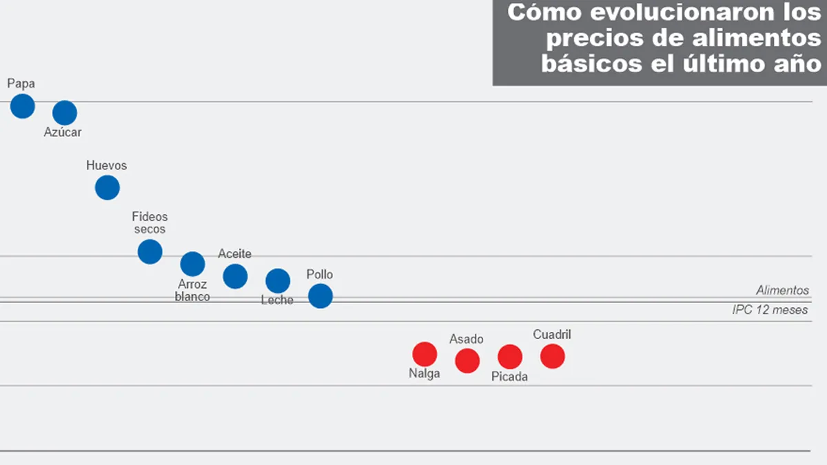Si ese es el podio de los alimentos básicos que más aumentaron, en el otro extremo hay una particularidad: se encuentran todos los cortes de carne vacuna que quedaron muy lejos de los incrementos generales de los alimentos. Allí hay una particularidad que no deja de generar complicaciones en la cadena cárnica: la sequía golpeó fuerte a los productores que debieron acelerar la salida de vacunos de sus campos ante la falta de pasturas, lo que motivó una gran oferta en el mercado que sirvió como contensión de los precios. Del otro lado, una bolsillo limitado de los consumidores hizo de complemento.