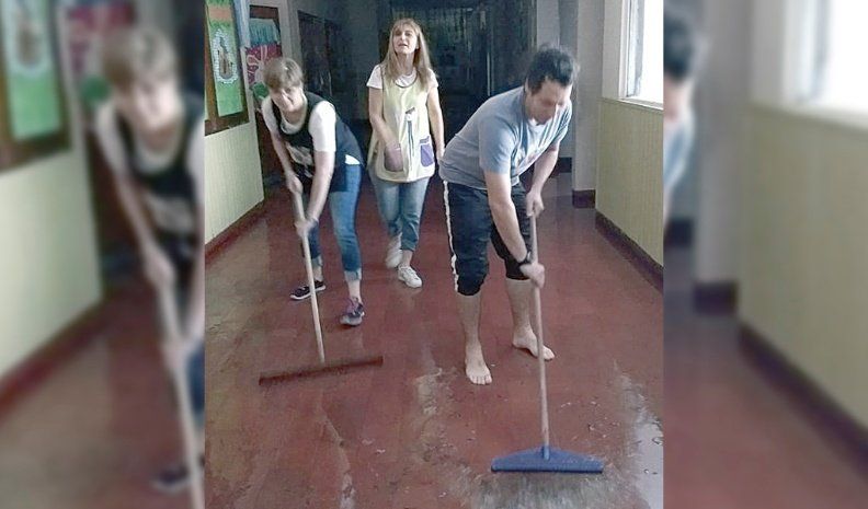 Docentes, quienes arribaron previo al inicio del dictado de clases, comenzaron con los trabajos de limpieza. No faltaron palos de piso y trapos para llevar adelante la limpieza, teniendo en cuenta que a esa hora del día se acondicionaba a la escuela para recibir a los alumnos del turno tarde. Luego, sobre el filo del mediodía, finalmente se dispuso suspender toda la actividad escolar y universitaria.