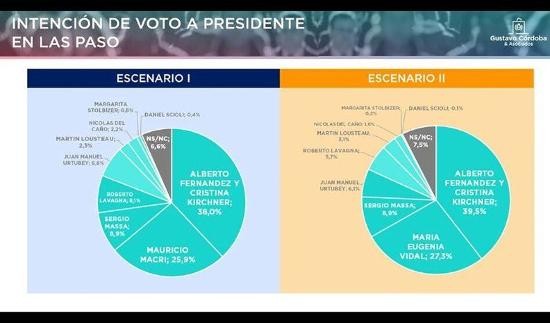 Según una encuesta hecha por la consultora Gustavo Córdoba & Asociados, la fórmula Alberto Fernández-Cristina Fernández supera a Mauricio Macri por 12,1 puntos.