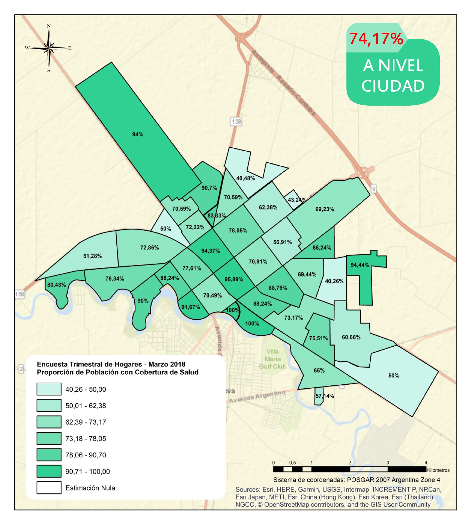 La cobertura promedio, según la ETH, es del 74,17 por ciento. La imagen que acompaña este escrito muestra la distribución espacial de la proporción de personas con algún tipo de cobertura de salud respecto de las personas que habitan cada barrio. Así, en tonalidades más intensas se observa mayor valor de proporción de personas con cobertura de salud y la menor intensidad es indicio de menor cobertura.