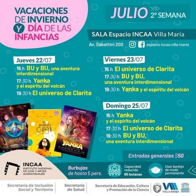 En este mismo espacio, el día domingo 25 de julio la grilla de actividades invernales propone dos funciones de las obras “¿Será para tanto?”, a las 16:00 horas, y de “Buscando una canción” a las 17:00 horas. En tanto, en el Espacio INCAA se proyectarán las películas “El Universo de Clarita”, “Bu y Bu, una aventura interdimensional” y “Yanka y el espíritu del volcán” en los horarios de 15:00, 17:30 y 19:30.
