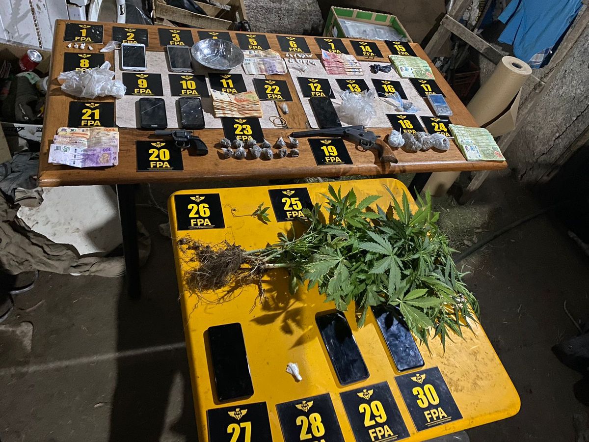 En el punto de venta cerrado, con destacada labor de los canes detectores de narcóticos, se logró la incautación de 250 dosis de marihuana y 63 de cocaína, siete plantas de cannabis sativa, dinero ($147.780), una balanza digital, dos armas de fuego (un calibre 22 y un pistolón) y elementos relacionados a la causa.