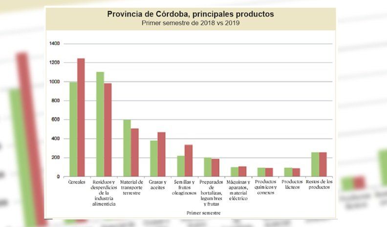 “Córdoba posee una estructura de exportaciones muy diversa. Los principales productos exportados fueron: cereales –principalmente maíz y trigo–, 29,2% del total exportado por la provincia; le siguieron residuos y desperdicios de la industria alimenticia –mayoritariamente harinas y pellets de soja–, 23%; material de transporte terrestre, 11,8% (particularmente vehículos automóviles terrestres y partes y piezas de vehículos y tractores); grasas y aceites, 10,9%; semillas y frutos oleaginosos, 7,8% (principalmente porotos de soja y maní); seguidos por preparados de hortalizas, legumbres y frutas; máquinas y aparatos, material eléctrico; productos químicos y conexos y productos lácteos.