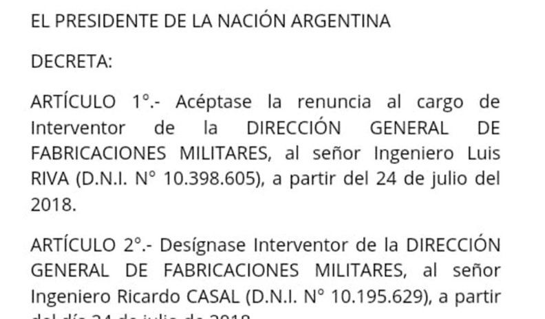 Hace minutos, y a través del Boletín Oficial, se conoció que el presidente Mauricio Macri le aceptó la renuncia a Luis Riva, quien se desempeñaba como interventor de Fabricaciones Militares.