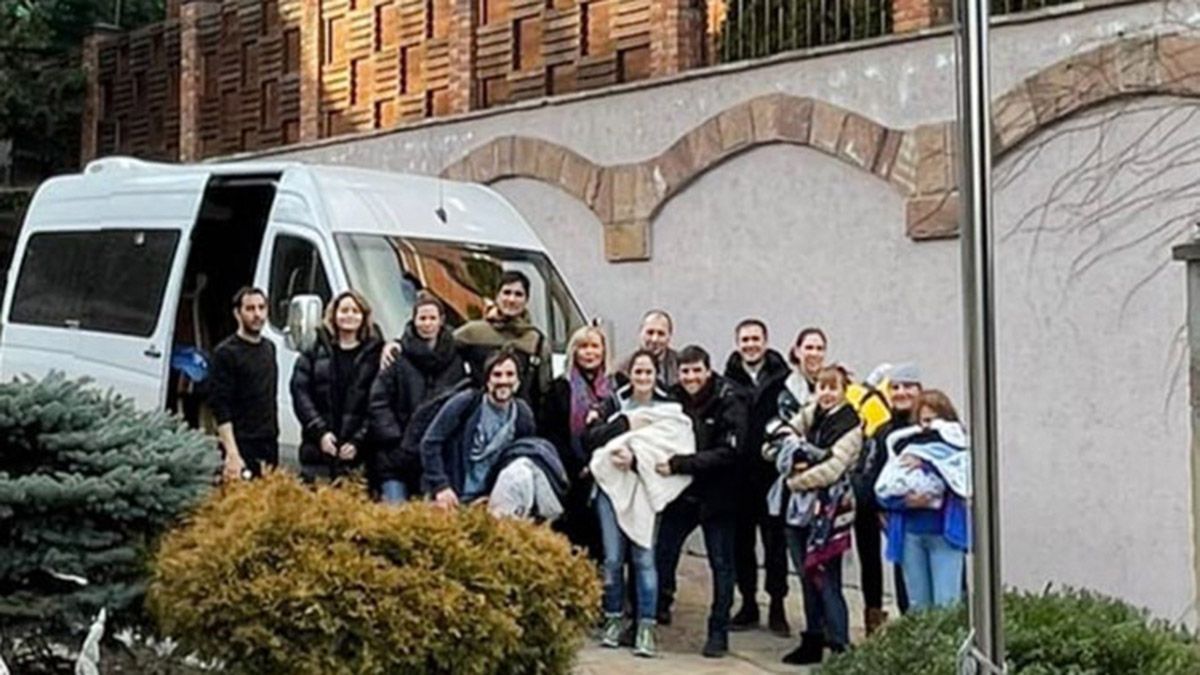 "Cinco familias argentinas con cinco bebés de vientres subrogados estaban alojadas desde el lunes en el sótano de la residencia de nuestra embajada en Ucrania. Ya se encuentran camino a Polonia. Gran trabajo de la embajadora Elena Mikusinski y del cuerpo diplomático", informó el canciller Santiago Cafiero en su cuenta de Twitter, junto con una foto de las familias en la puerta de la residencia y la combi que las trasladaba.