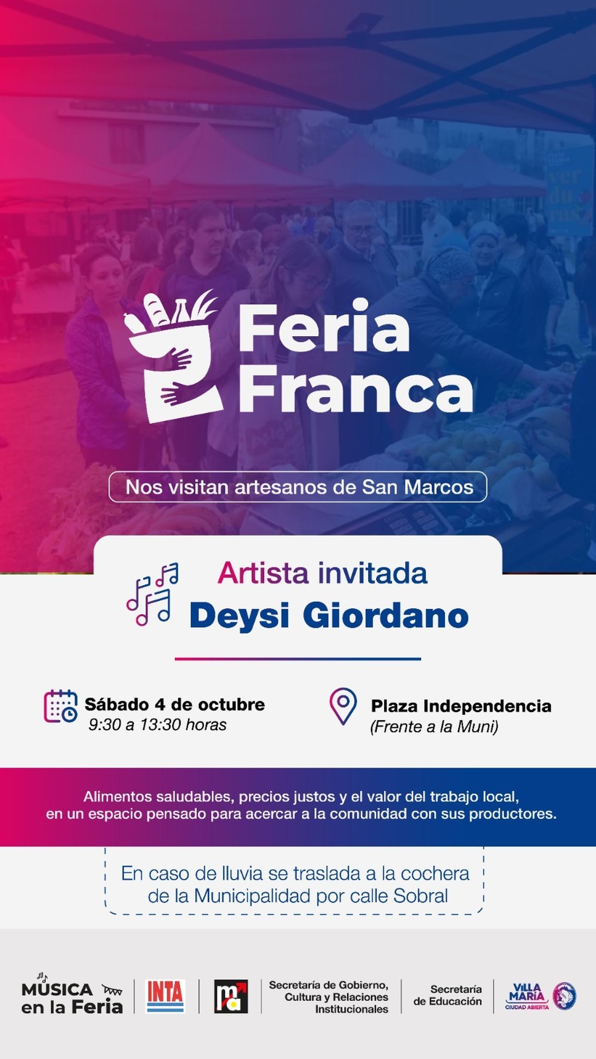 La jornada se desarrollará de 9:30 a 13:30 frente al Palacio Municipal. Habrá alimentos frescos, artesanías y la actuación de Deysi Giordano