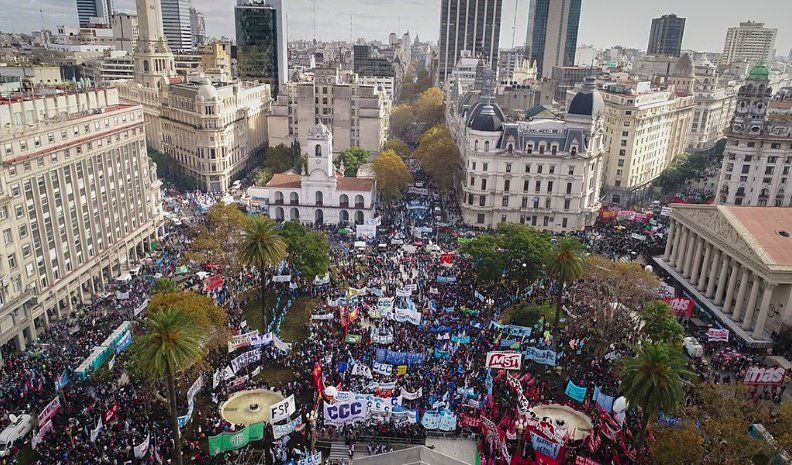 Organizaciones gremiales y sociales concluyeron ayer su multitudinaria Marcha Federal con un acto en la Plaza de Mayo, donde advirtieron que el Gobierno "pone en riesgo la paz social" con sus políticas económicas, cuestionaron la suba de tarifas y el acuerdo con el FMI y reclamaron un "paro nacional", que durante la jornada la CGT confirmó que convocará para antes del Mundial.