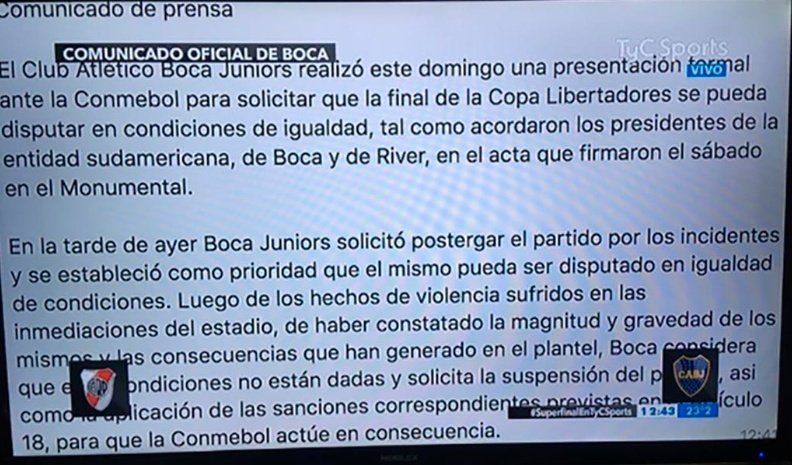 Boca Juniors elevó hoy ante la Conmebol un pedido para la suspensión de la superfinal de la Copa Libertadores ante River Plate, que fue reprogramada para este domingo a las 17 en el Monumental, además de solicitar la aplicación de sanciones al club local por el ataque al micro de los jugadores "xeneizes".