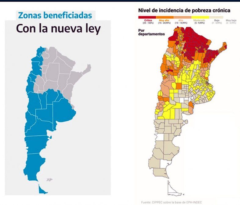 En un mapa que se conoció durante el fin de semana, difundido por el magíster en Economía Julián Folgar, cuya fuente fue el Cippec en base a datos de la EPH del Indec, mostró cómo las zonas beneficiadas por ser incluidas en el aporte de subsidios tienen, en general, una menor incidencia de pobreza crónica. Como se dijo, el NEA y NOA son las más vulnerables socialmente y allí no llegan los beneficios porque en la primera no llegan las redes y en la segunda la conexión es baja y casualmente no alcanza a los más postergados.