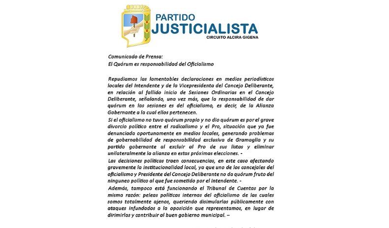 El primero en salir a responder ante esta insólita situación fue el PJ de Alcira Gigena. A través de un comunicado firmado por su presidenta, el partido opositor plantea su postura señalando: “Si el oficialismo no tuvo quórum propio y no dio quórum es por el grave divorcio político entre el radicalismo y el Pro, situación que ya fue denunciada oportunamente, en medios locales, generando problemas de gobernabilidad de responsabilidad exclusiva de Gramaglia y su partido gobernante”.
