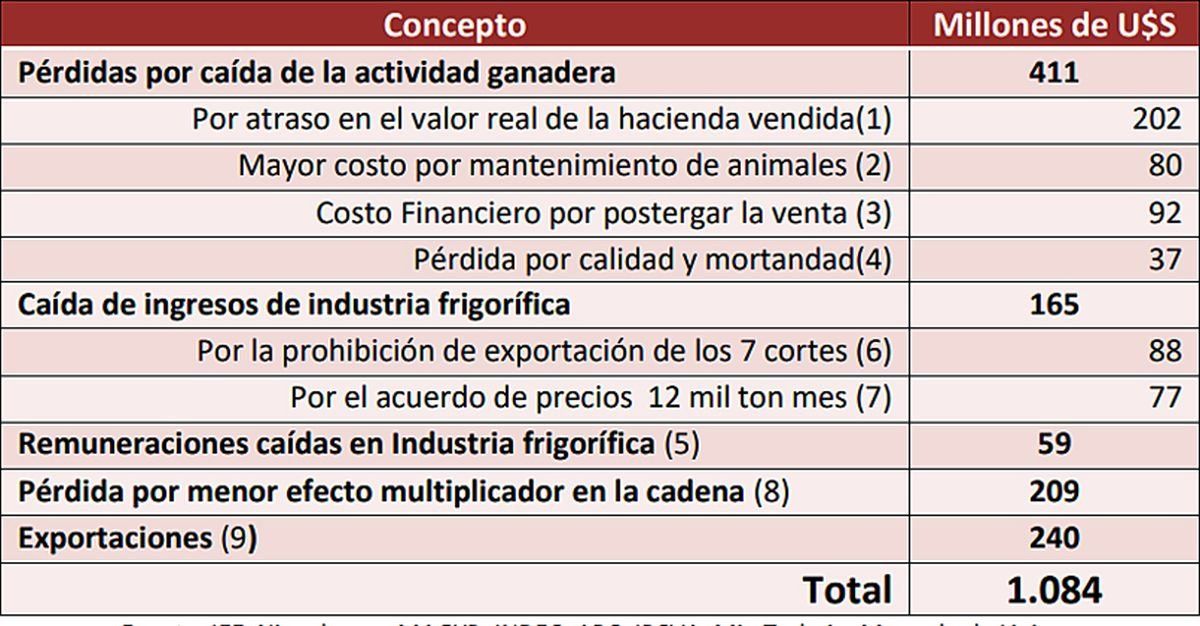 Según ese trabajo, la cadena de ganados y carnes acumuló pérdidas por US$ 1.084 millones, cifra que representa más de U$S 8 millones por día de intervención.