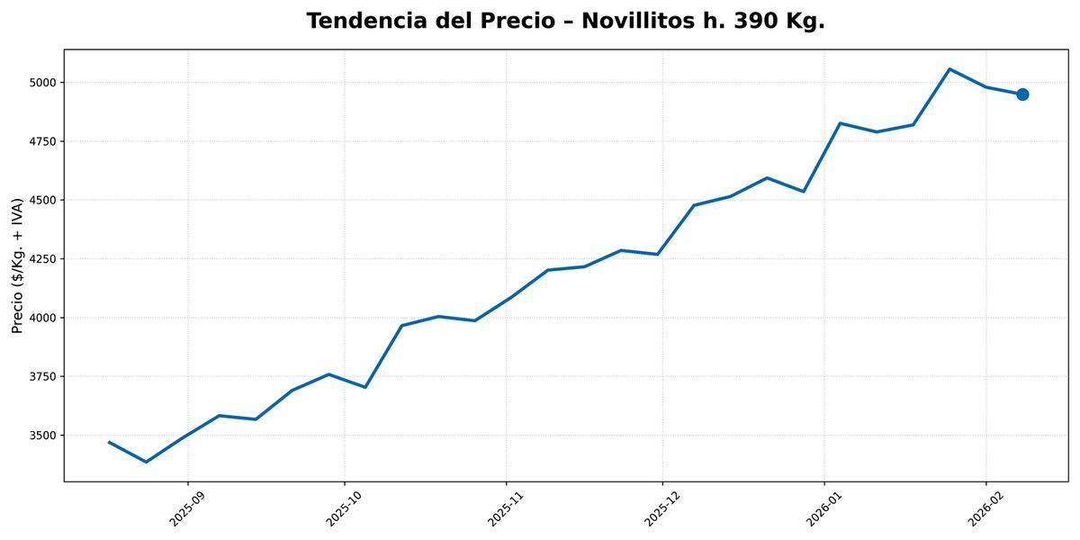 Los precios de la hacienda siguen en valores elevados y se muestran con firmeza, lejos de mostrar posibilidades de un escenario de cambio. Mientras los novillitos de hasta 390 kilos se comercializaban en $3.500 el kilo vivo para el inicio de la primavera, a partir de ahí comenzaron una escalada sin pausa hasta llegar esta semana a ubicarse por encima de los $5 mil en Cañuelas.
