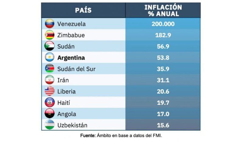 Con el 53,8% que arrojó la inflación en el país, la Argentina se ubica en el cuarto puesto en el ranking de inflación mundial, según surge de comparar la cifra que ayer difundió el Indec con las previsiones el Fondo Monetario Internacional. Sólo es superada por Venezuela –en hiperinflación– Zimbabue (183%) y Sudán (57%).