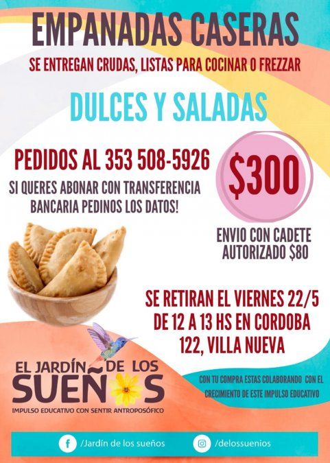 Según explicaron, los pedidos deben realizarse al número telefónico de Soledad (353-5085926). Un flyer compartido por la organización dio cuenta que la docena de empanadas (dulces o saladas) cuesta 300 pesos. Las mismas se deben retirar el próximo viernes 22 de mayo en Villa Nueva (calle Córdoba 122) de 12 a 13 horas.