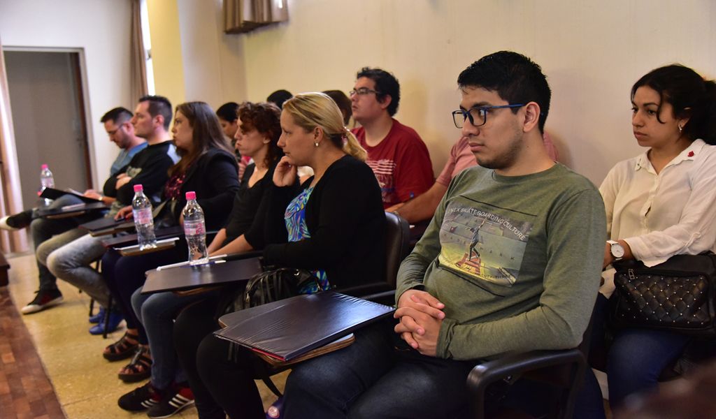 El secretario Guillermo Picco ingresa a la sala. Les explica que, cuando inicie la audiencia, se les tomará juramento. Luego se retira y personal judicial le entrega una botella a cada uno de ellos. Mientras tanto, la asesora letrada Silvina Muñoz entra al recinto, deja su cartera y se va.