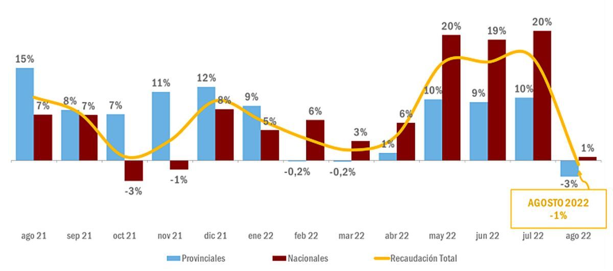 También muestra un contraste el resultado de agosto frente al trimestre previo porque en mayo, junio y julio se habían registrado aumentos reales de recaudación del 10%, 9% y 10%, respectivamente.