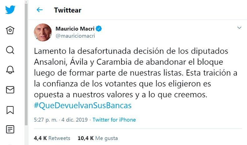 El presidente Mauricio Macri cuestionó ayer la decisión de los diputados Miguel Ansaloni, Beatriz Ávila y Antonio Carambia, quienes decidieron abandonar el bloque de Juntos por el Cambio tras haber sido electos por ese partido, y les exigió devolver sus bancas.