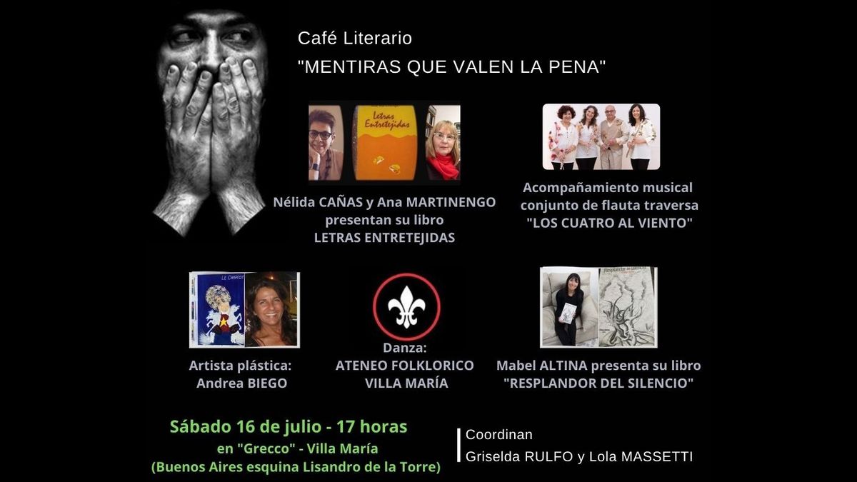 El sábado 16 de julio a partir de las 17 horas en Grecco (Lisandro de la Torre esquina Buenos Aires) se llevará a cabo una nueva reunión del Café literario Mentiras que valen la Pena coordinado por Lola Massetti y Griselda Rulfo.