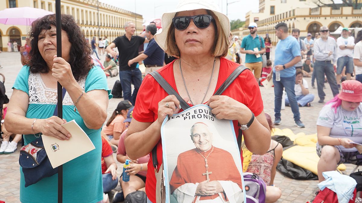 Con dos pantallas a los costados del escenario, que mostraban la fotografía del cardenal Pironio, otra bandera con su imagen puesta en lo alto de la mitad de la cúpula de la Basílica, las personas que se acercaron al escenario repetían: "Viva la virgen de Luján, viva el cardenal Pironio y viva la Iglesia".