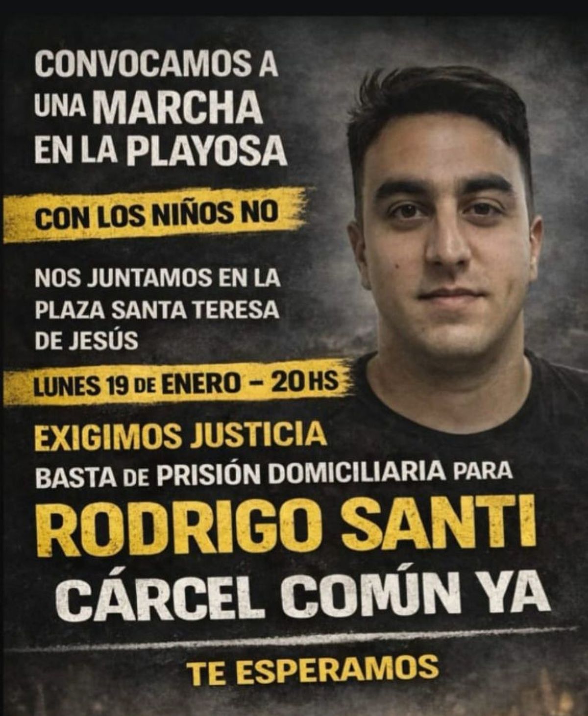 Este lunes se realizará una nueva manifestación en La Playosa para reclamar justicia y exigir que Rodrigo Santi, imputado como autor del delito de abuso sexual a menores , deje el régimen de prisión domiciliaria y sea trasladado a una unidad penitenciaria.