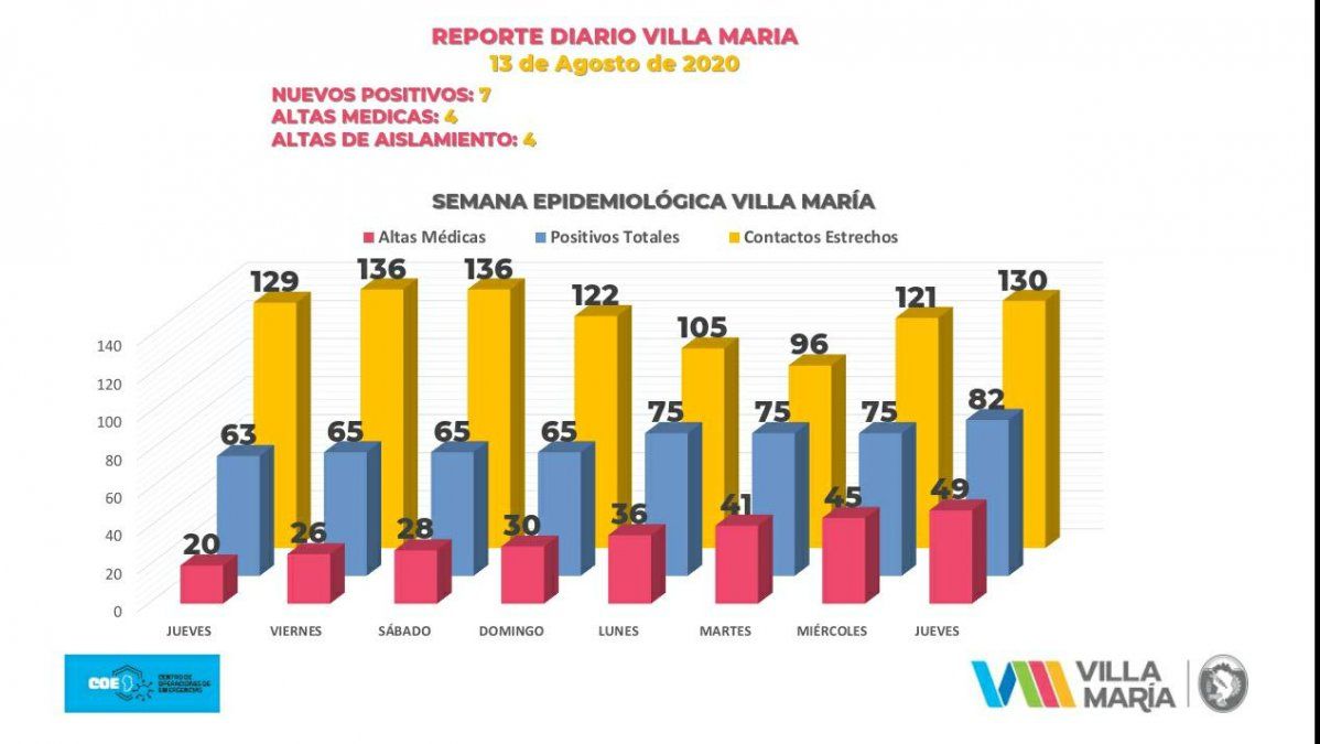 El informe sobre Covid-19 que brindaron anoche el intendente de Villa María Pablo Rosso y el jefe de Gabinete Héctor Muñoz entregó dos novedades: la primera tiene que ver con que ya se ocupan los albergues que dispuso el Municipio para personas asintomáticas, y la segunda, con que se confirmaron 7 nuevos contagios de coronavirus en la jornada de ayer.El informe sobre Covid-19 que brindaron anoche el intendente de Villa María Pablo Rosso y el jefe de Gabinete Héctor Muñoz entregó dos novedades: la primera tiene que ver con que ya se ocupan los albergues que dispuso el Municipio para personas asintomáticas, y la segunda, con que se confirmaron 7 nuevos contagios de coronavirus en la jornada de ayer.Rosso sostuvo que con los nuevos positivos “se encendieron las luces de alarma en la ciudad”. El jefe comunal dijo además que en las últimas 24 horas ya se ocuparon plazas de aislamiento.Villa María cuenta desde hace meses con tres albergues para garantizar la cuarentena a pacientes asintomáticos o quienes requieran aislamiento y no puedan transitar el cuadro en sus hogares. Los albergues que están a disposición de la ciudad y sus habitantes son los siguientes: la Iglesia de Jesucristo de los Santos de los Últimos Días, Club Alumni y Casa Nazareth.“En las dos primeras hemos tenido la posibilidad de prepararlas de tal manera que alojen a 20 personas cada una”, indicó Muñoz haciendo uso de la palabra.Cabe señalar que dichos espacios cuentan con personal médico, administrativo y de limpieza. Quienes allí se hospedan reciben además alimentos y elementos de higiene.La casa de Nazareth, con el mismo criterio, brinda la posibilidad de alojar casos positivos pero asintomáticos. “Hay muchas personas que cursan la enfermedad de manera asintomática”, indicó el jefe de Gabinete. Volviendo a la gráfica de coronavirus, el intendente remarcó que los casos activos ascienden a 33, dado que en el día de ayer se dieron 4 altas médicas definitivas. Además, 4 personas obtuvieron el alta de aislamiento.Desde el Municipio informaron que son actualmente 163 los aislados, de los cuales 130 son contactos estrechos. De ellos, 23 aguardan los resultados y 107 recibieron el primer hisopado negativo.