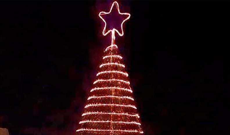 Un total de 1.300 botellas de vidrio dan forma a un gigantesco árbol de Navidad que decora la avenida principal de Coronel Baigorria.