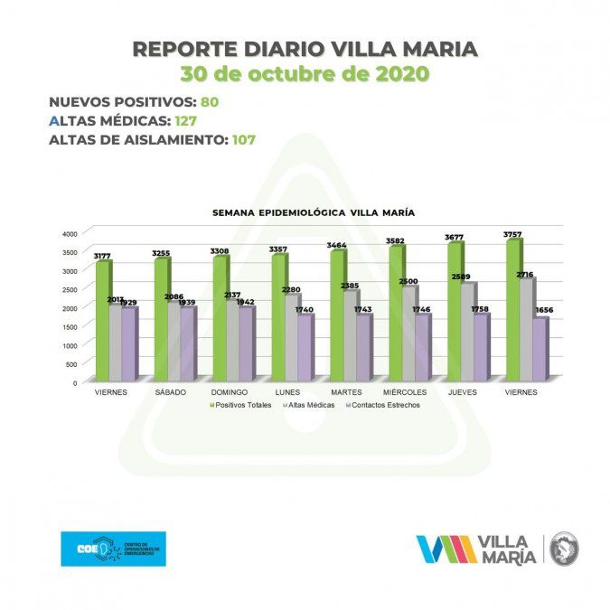 En cuanto a testeos, en la jornada de hoy en los cuatro centros dispuestos por el municipio -Asistencia Pública, los centros vecinales de barrios Rivadavia y General Paz y el Centro de Promoción Familiar Ana María Solís de barrio Los Olmos-, se realizaron 103 pruebas, arrojando resultado positivo 21 de ellos y 82 negativos.