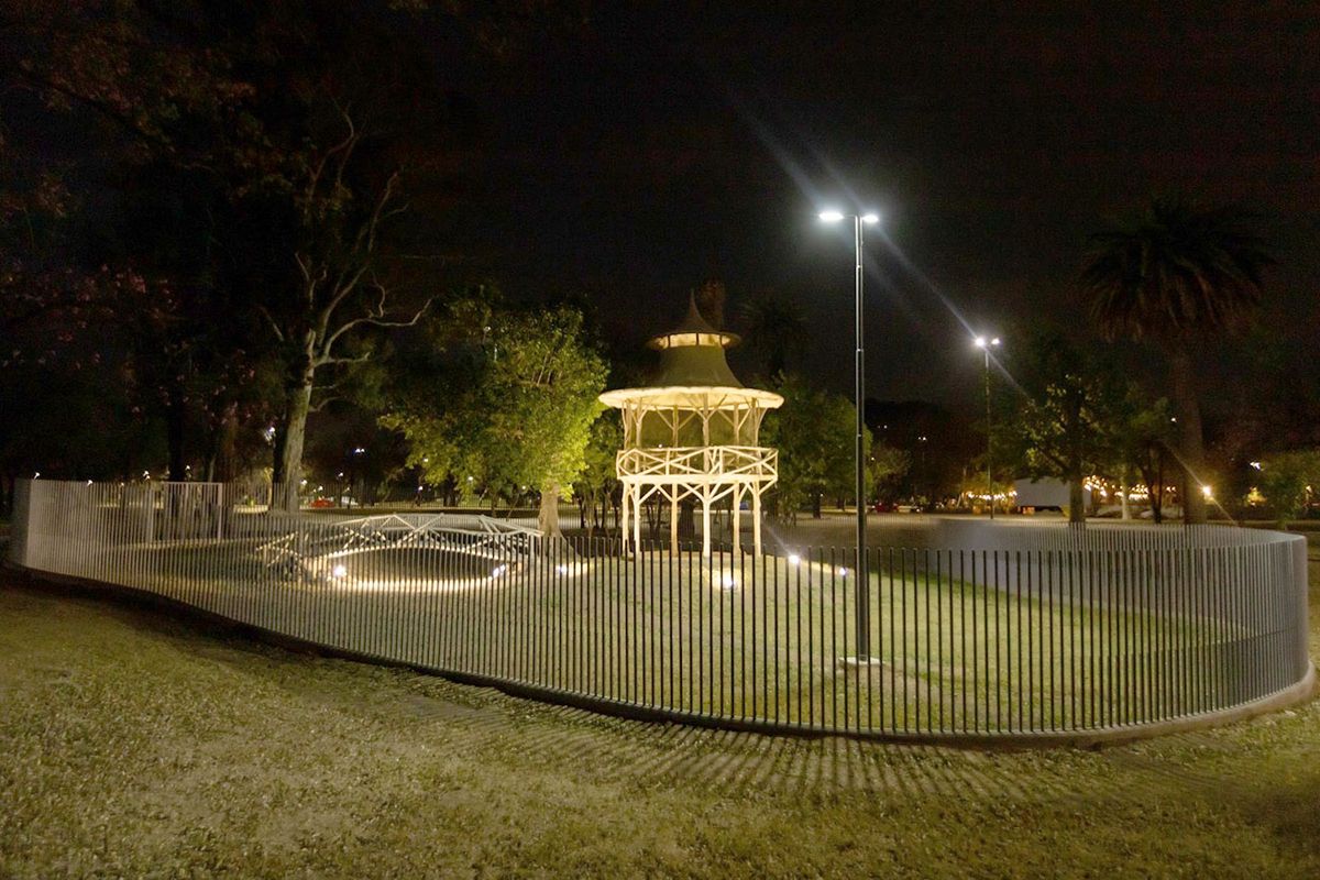 Además, se incorporó una nueva torre de iluminación con dos proyectores que permiten que se aprecie su particular cubierto. A los fines de evitar volver a ser vandalizado, se dispuso una reja en todo su perímetro circundante.