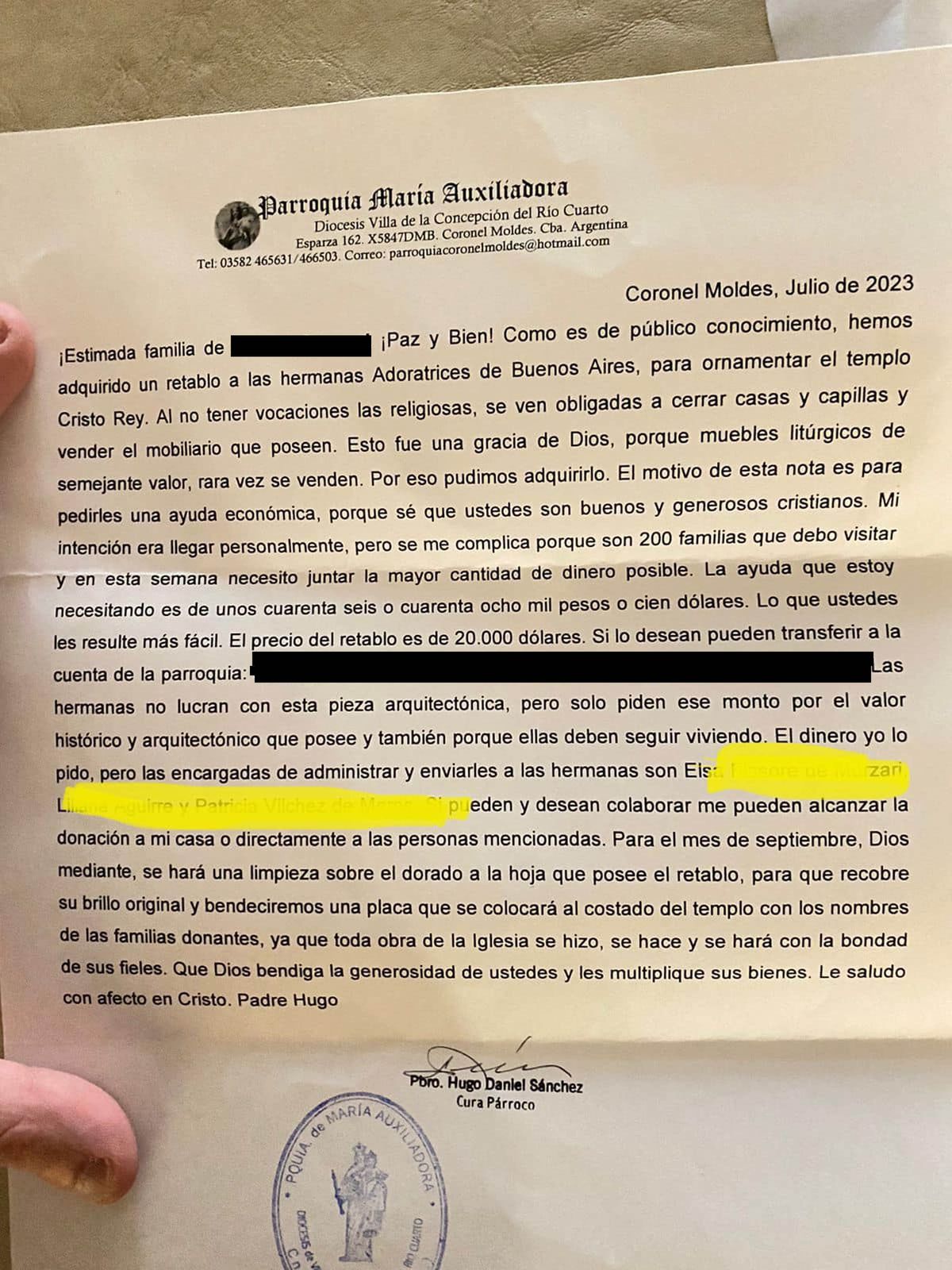 Una polémica se desató en las últimas horas en la localidad cordobesa de Coronel Moldes, luego de que el cura párroco Hugo Sánchez solicitara a varias familias, a través de una carta, que colaboren con donaciones para la compra de un retablo perteneciente a las Hermanas Adoratrices de Buenos Aires por un valor de 20 mil dólares.