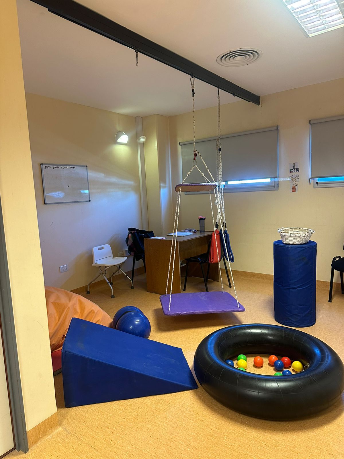 “A través de este dispositivo pudimos sumar una hamaca en suspensión, pero también podemos anexar otros elementos, dependiendo las funciones y los inputs sensoriales que se quieran trabajar”, detalló la profesional.