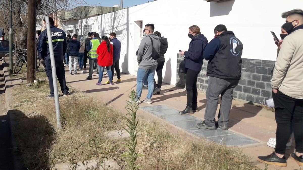 Una larga fila de vecinos se ubicó por la vereda de calle Córdoba, desde Boulevard Fangio, lugar donde se encuentra el acceso al vacunatorio masivo o Club Atlético Defensores.