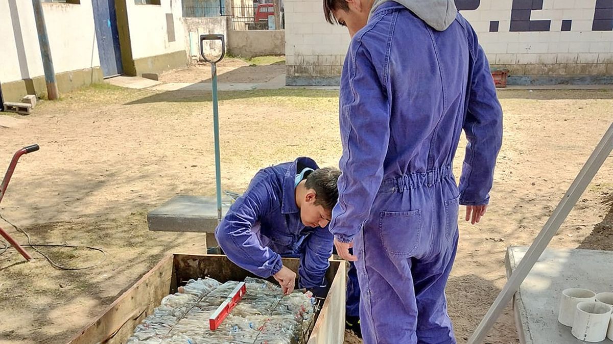 “Empezamos a pensar cómo podíamos hacer adoquines de forma casera y fuimos buscando la fórmula. De a poco fuimos viendo resultados hasta encontrar un adoquín resistente conm plástico molido. Ya hicimos bancos y una mesa con fardos de botellas prensadas”, señaló uno de los alumnos.