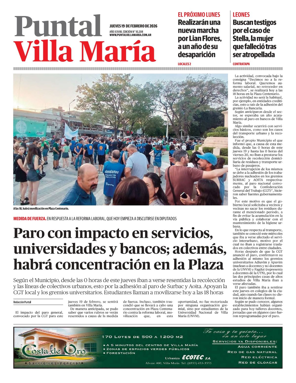 Villa María | Puntal | diario | Accedé a la edición digital de Diario Puntal Villa María Te acercamos el diario completo para que no te pierdas ninguna de nuestras notas 19 de febrero de 2026 - 09:46