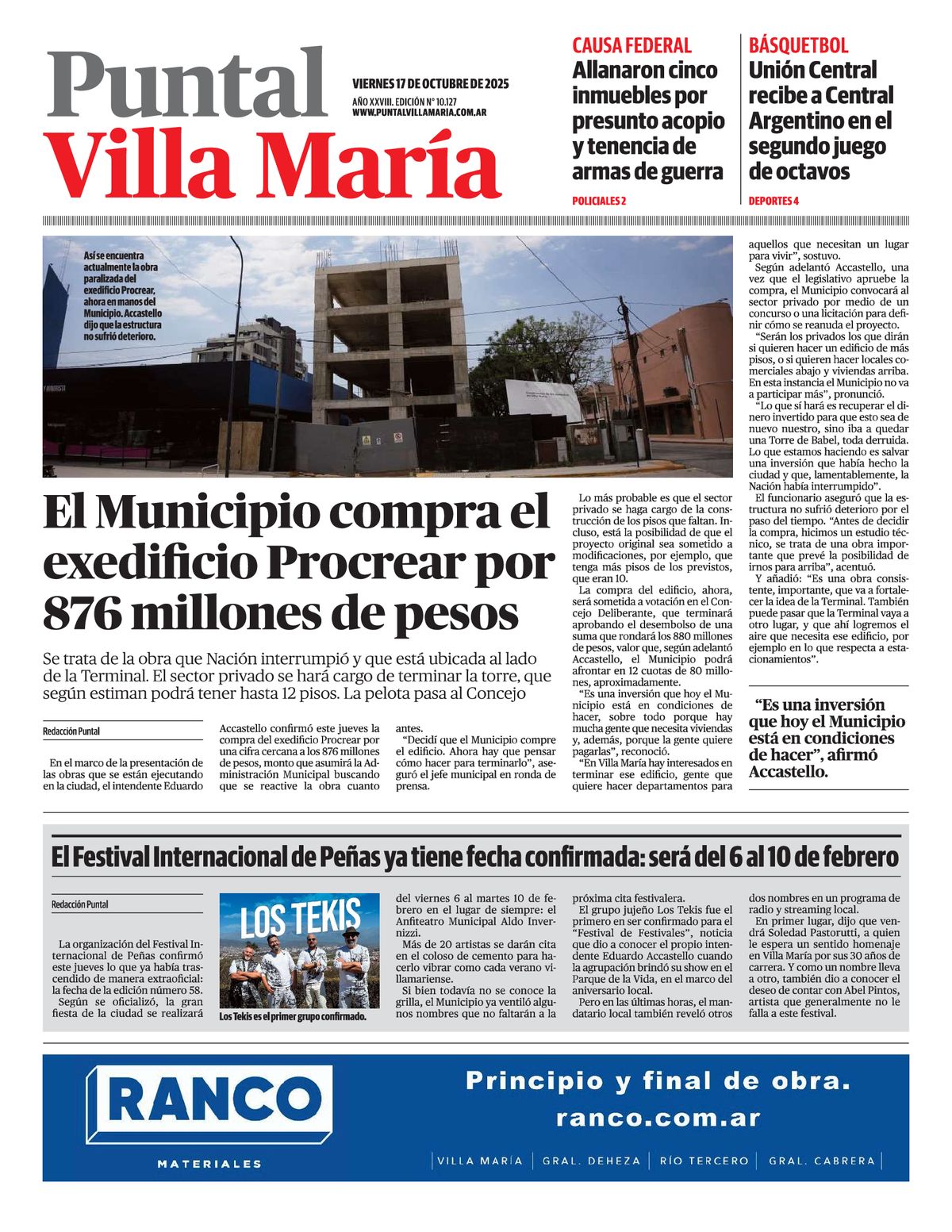 Villa María | Puntal | Accedé a la edición impresa de Diario Puntal Villa María Te acercamos el diario completo para que no te pierdas ninguna de nuestras notas 17 de octubre de 2025 - 09:50
