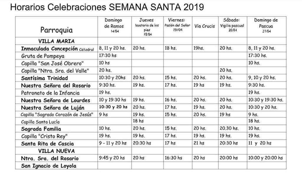 Para el miércoles, las actividades religiosas se concentrarán en el templo mayor de la diócesis villamariense, donde el obispo, Samuel Jofré, encabezará la “Misa Crismal”, junto a todos los sacerdotes de la ciudad y la región.
