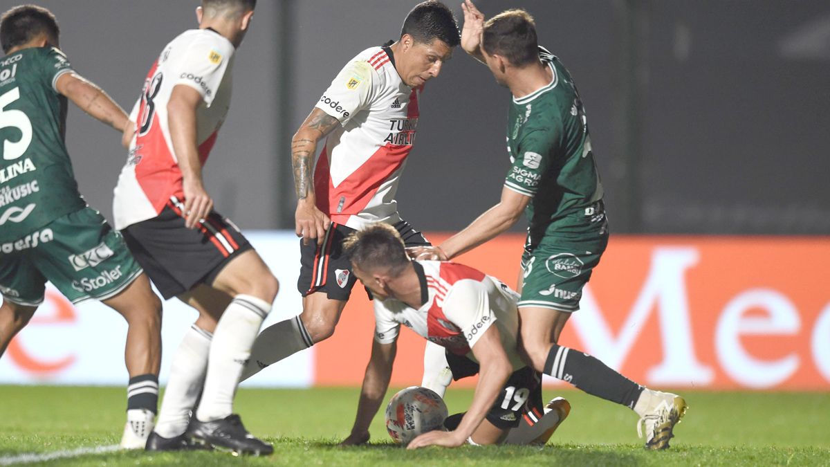 Una pérdida dentro del área riverplatense pudo costarle el segundo gol a su equipo inmediatamente después que los juninenses se pusieran en ventaja a los 11’ tras un extraño gol convertido por Gabriel Alanis tras un fallido del otro lateral, Milton Casco.