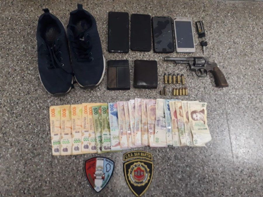 Agentes de la Departamental San Martín secuestraron un revólver marca Manque, municiones (seis cartuchos 9 mm y cinco 32 mm largo), tres celulares de distintas marcas y dinero en efectivo (aproximadamente 6.950 pesos).