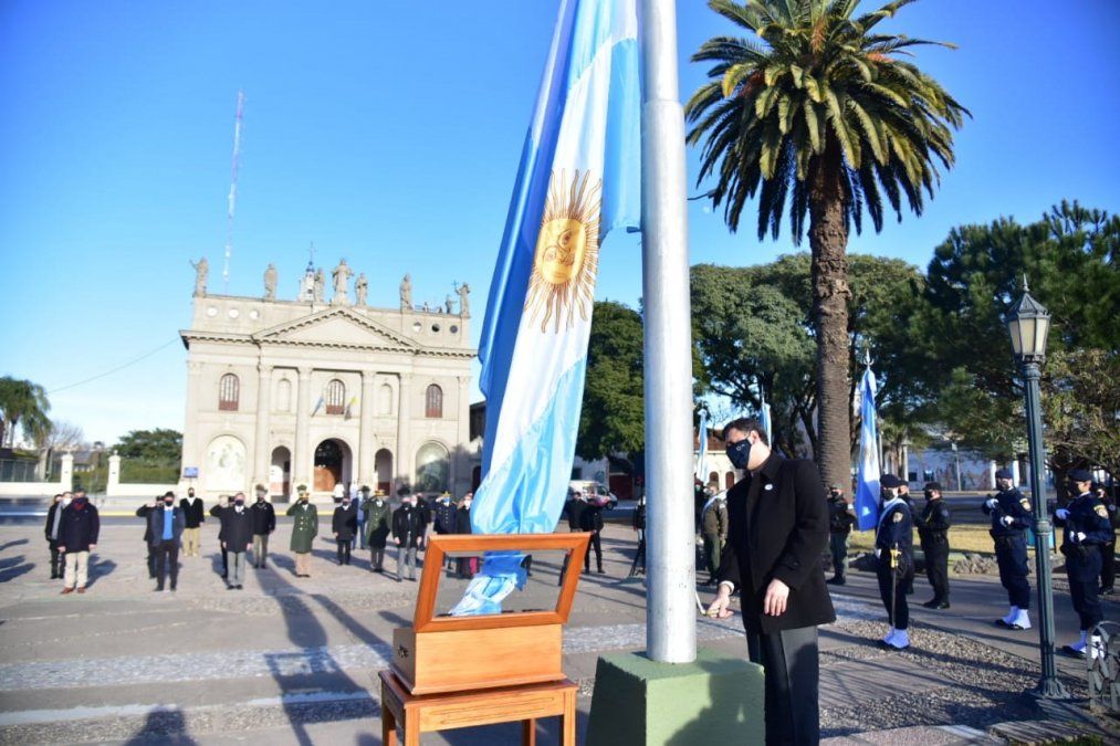 El evento inició con el izamiento del Pabellón Argentino, que estuvo a cargo de Rosso. Mientras el funcionario ponía en alto la celeste y blanca, las estrofas del Himno Nacional Argentino eran entonadas por quienes acompañaban la conmemoración.