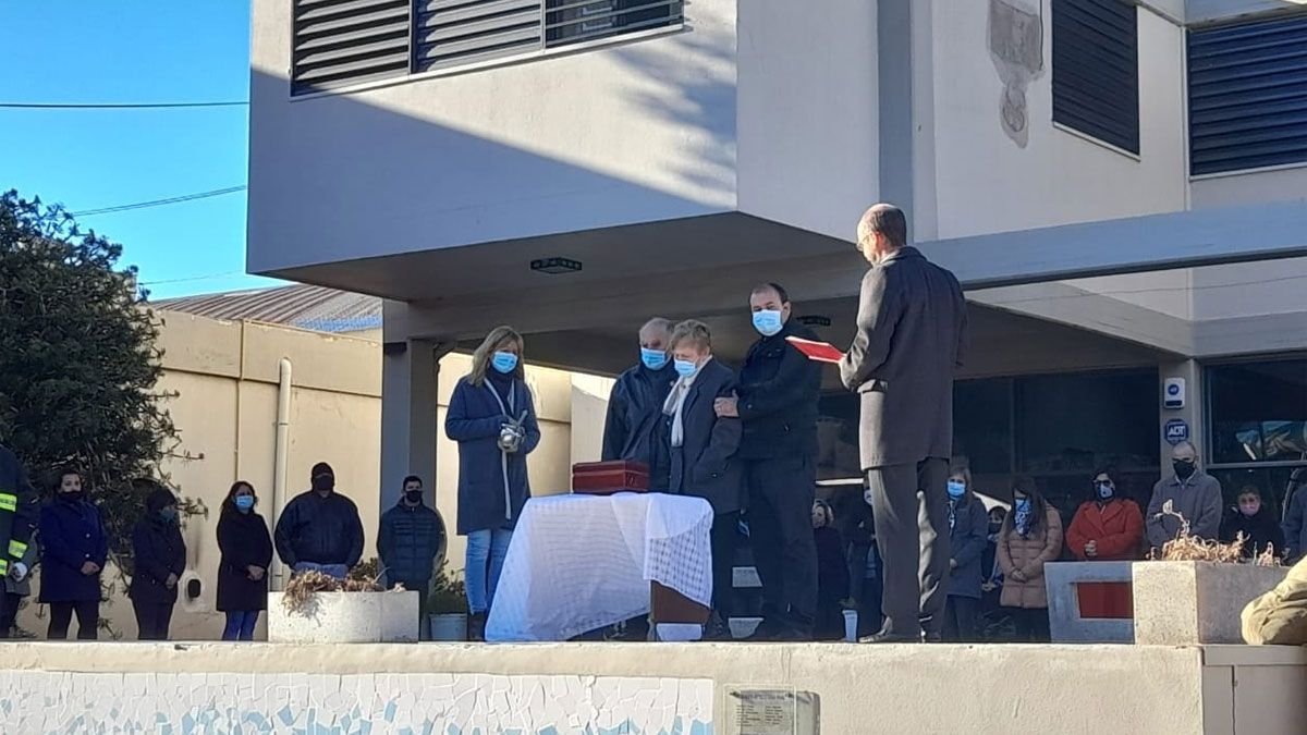 La urna funeraria estuvo expuesta varios minutos en el frente la Municipalidad y luego fue trasladada hasta su sepultura en el cementerio local, con la reducida presencia de allegados, familiares y funcionarios.