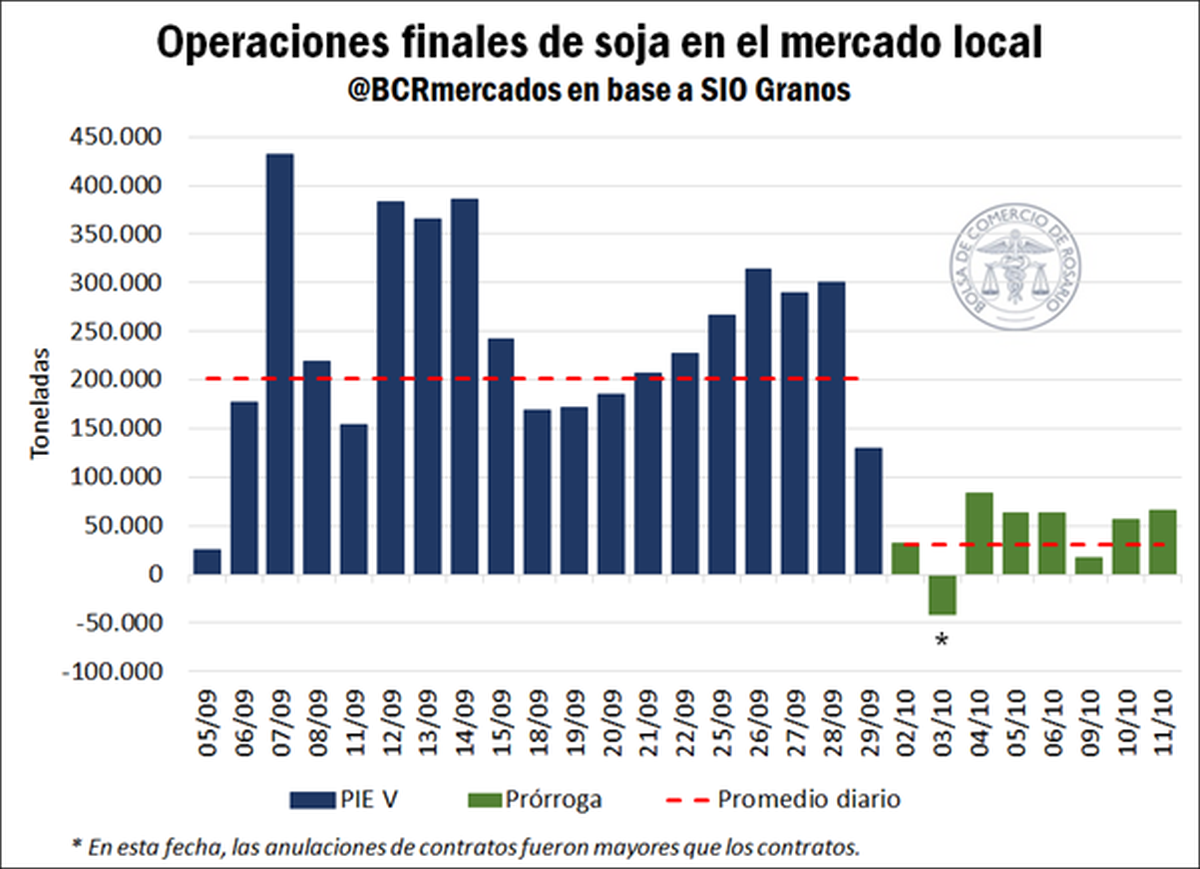 Mientras que el volumen promedio diario de toneladas negociadas en la instancia inicial del dólar soja IV fue de casi 202.000 toneladas, desde el inicio del período de prórroga hasta la actualidad se llevan comercializadas un promedio diario de 31.000 toneladas. “En otras palabras, se observa una caída del 85% en el volumen de soja promedio diario comercializado en octubre”, explicó un informe de la Bolsa de Comercio de Rosario.