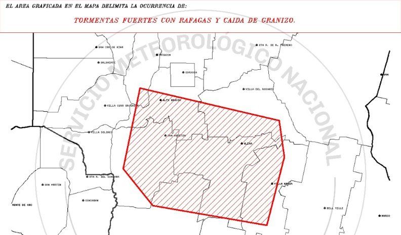 De acuerdo a lo especificado, el temporal afectaría a los departamentos General San Martín (parcialmente), Calamuchita, Punilla, Río Segundo, Río Cuarto, Tercero Arriba y Santa María.