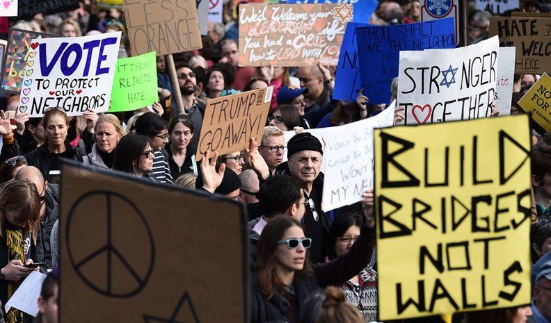 "¡Presidente del odio, vete de nuestro estado (Pensilvania)!" y "Trump, renuncia ya al nacionalismo blanco", se podía leer en pancartas exhibidas en la concentración cerca de la Sinagoga del Árbol de la Vida, donde ocurrió la masacre el sábado.