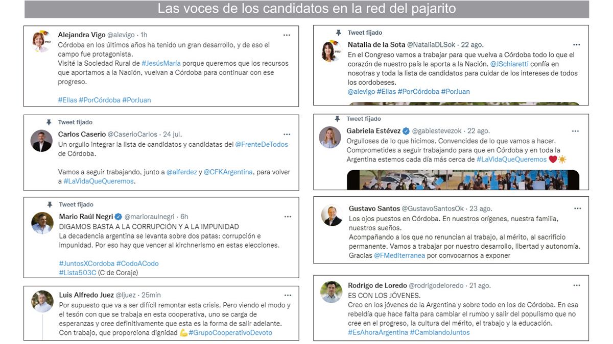 En las legislativas de Córdoba, algunos comenzaron tímidamente por Twitter, la expresión más contundente en la que prefieren habitar políticos, periodistas, dirigentes gremiales y empresariales, entre otros. El microclima de la política tiene su espacio en la red del pajarito y allí suben mensajes y definiciones que tienen que ver con el día a día de las recorridas por las distintas localidades y barrios, conversaciones con vecinos, fotos de visitas a empresas o comercios. Todo sirve para comunicar y mostrarse activos.