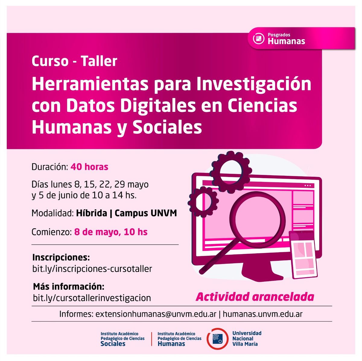 Se encuentran abiertas las inscripciones para el curso de posgrado Herramientas para la Investigación con datos digitales en Ciencias Humanas y Sociales, dictado por el Instituto de Ciencias Humanas de la Universidad Nacional de Villa María en el marco de la Especialización en Tecnologías de la Información y la Comunicación para la Enseñanza en Educación Superior. Comienza en mayo.